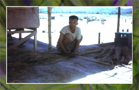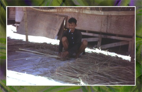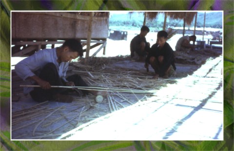 Vietnamese workers making mats for wall and roof, Aug 69.