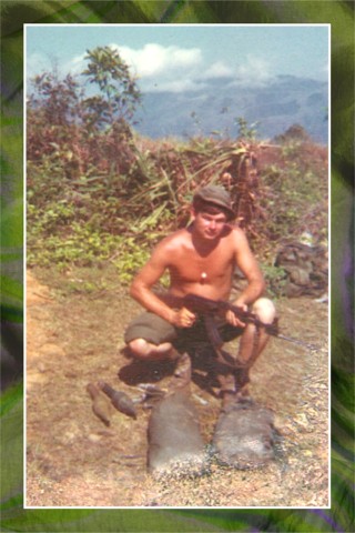 Here is Pete Simpson with some assorted, captured enemy equipment and rice, with thanks to a successful "mechanical ambush."