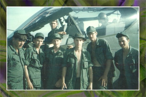 These grunts from 2nd platoon are checking out a Cobra that landed on Hill 4-11. From left to right: Unknown, Troy Williams, Mike Daly, Steve Jones, Richard Guertin, Gregg Gawthorpe, and George Hardman in the front seat.
