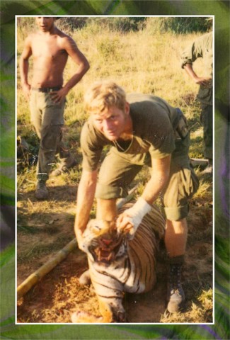 This tiger crawled up to the perimeter and was met with a claymore mine. The upper teeth were removed before the camera arrived. Gary carried one of the bottom fangs in his pocket for about a week, until he couldn't stand the smell from the rotting tooth. Gary is holding the tiger's head. George Ambrose (medic) is watching.