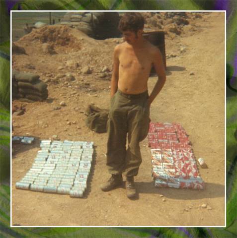 Upon returning to FSB Hill 4-11, the grunts were usually treated to beer and sodas, or Class VI rations. Here is SP4 Berret, radio-telephone operator (RTO) for the 3rd Platoon, sorting out the beer and sodas for his platoon.