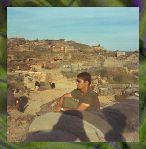 This picture of SP4 Nieves was taken near the Weapons Platoon's area on FSB Hill 4-11. On the right is an aiming stake and the 81mm mortar pit. In the top center of the picture is the "ammo dump" for the 3rd Battalion, 1st Infantry. Prior to returning to the field for another mission, everyone would stop by the ammo dump first to reload with ammunition.