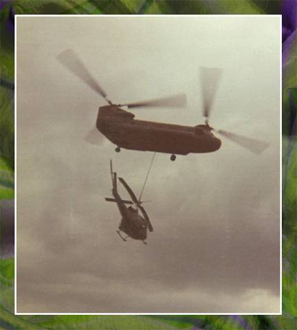 On one of their patrols in the field, a disabled "huey slick" stayed overnight with 3rd Platoon at one of their night laggers. The next day a CH-47 Chinook helicopter lifted the disabled bird out of the field.
