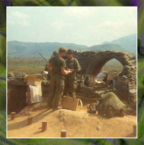 This is a picture of "Doc" Salaski, left, and SSG Nigro, right, at the 3rd Platoon's CP bunker sorting out cigarettes and other necessities from an "SP" pack. In addition to cigarettes, "SP" packs contained candy, chewing gum, soap, razors, shaving cream, needle and thread kits, and a lot of other miscellaneous stuff the grunts didn't have access to while on "The Hill" and out in the field.