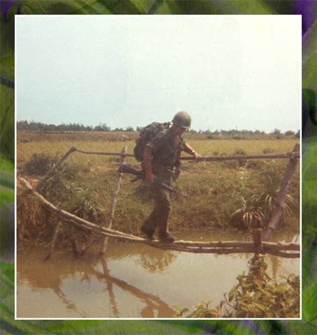 This is "Doc" Salaski again, but this time he's crossing a bamboo foot bridge. A hairy experience, especially with a steel-pot on your head, a rucksack on your back, and an M-16 in one hand.