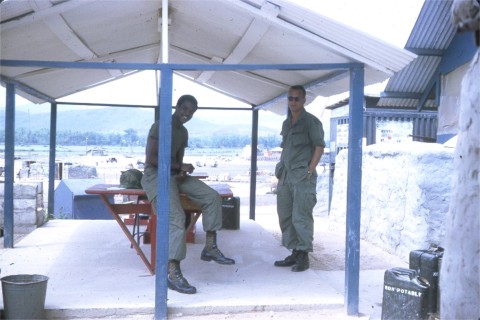 Medic Foxworth at the Aid Station's patio with another G.I.  (April 1970)