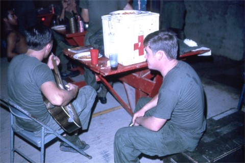 Medics on the Aid Station's patio at night. Medic Burns is on the right. (December 1970)