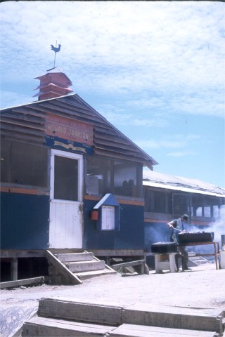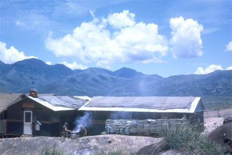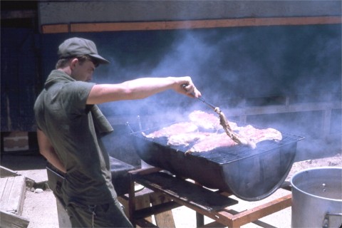 A cook grilling food outside of Howard Johnson's, the battalion messhall on FSB 4-11. (July 70)
