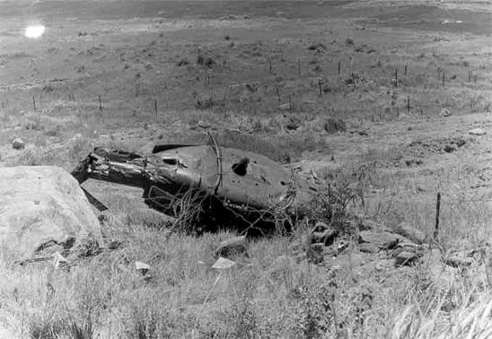 The carcass of a downed Huey that was left inside the perimeter wire at FSB Hill 4-11.
