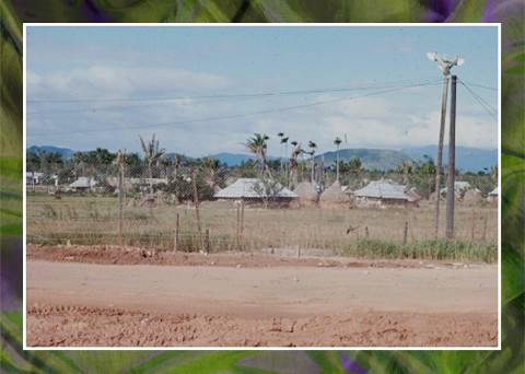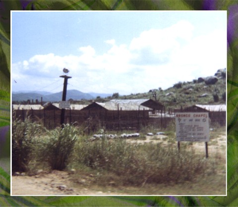 Seen here in the center of this picture, a POW camp was located near the Bronco Chapel and the headquarters for the 3rd Battalion, 1st Infantry. Painted in white on the roofs of the buildings, but not visible in the picture, were large letters spelling out POW. The sign on the pole near the center of the picture says "Restricted Area, No Photography." Little did the sign work.