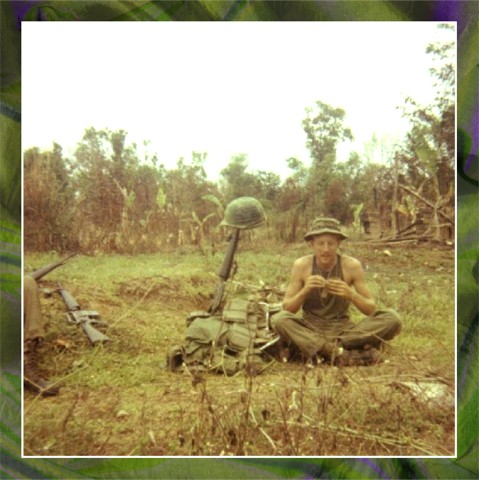 Here's a shot of Phillip Tinkle opening a can of C-Rations during a lunch break.